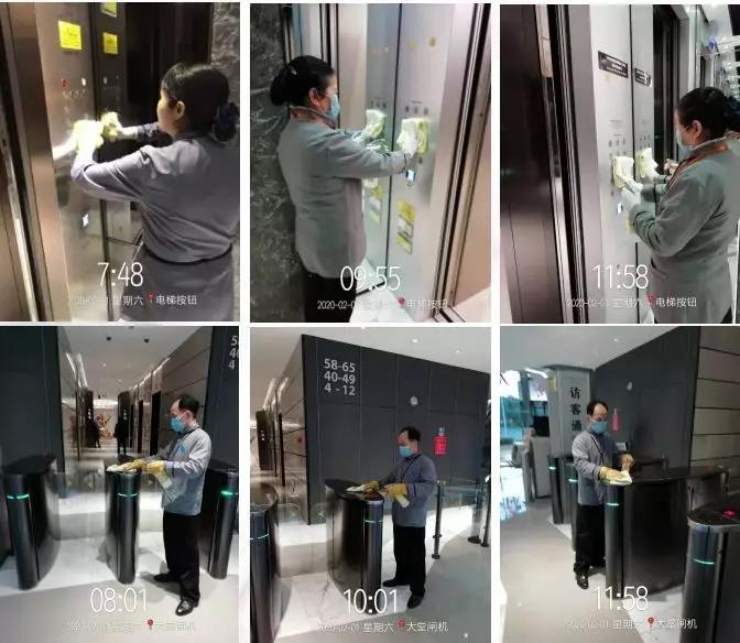 、17:20-18:00)安排保洁员定岗,使用德国进口的德倍洗消毒清洁剂频繁消毒。DG视讯金融大厦使用香港邓氏万能消毒清洁剂进行清洁消毒,频次保持每2小时一次,上下班高峰期为每1小时一次。同时加强各出入口通道、手扶梯、洗手间等区域的消毒频次。