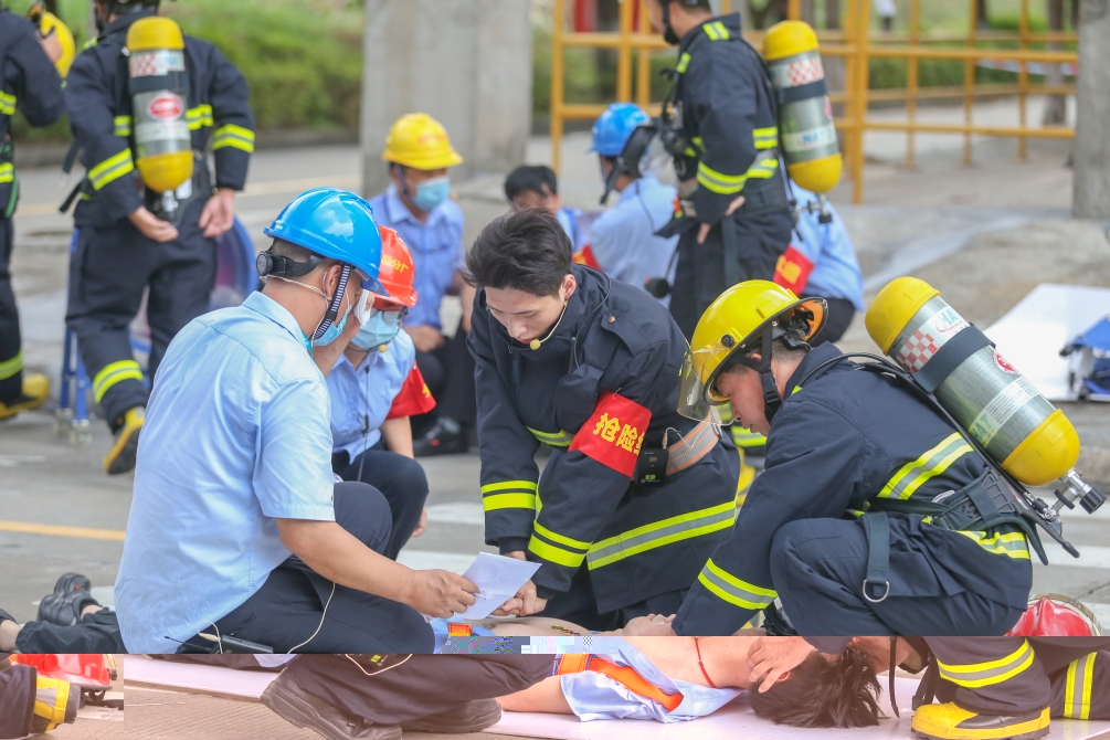 随后,演练模拟了新产品分厂在进行浆塔搅拌器检修作业时,因作业人员不规范作业造成在作业塔内中毒窒息倒地的有限空间作业事故场景,公司立即按应急预案要求成立现场指挥部,组织技术组、抢险组、警戒组、救护组,通过信息逐级报送、应急联动、应急响应、群众疏散安置、预警、现场指挥等环节开展事故前期处置,应急管理部门、120急救中心医疗组与公司各应急救援小组快速联动,人员陆续被救出并送往临时医疗点实施抢救,恢复生命体征后被送往医院进一步救治,达到了“磨合应急联动机制,锤炼应急救援队伍,检验应急预案”的目的。