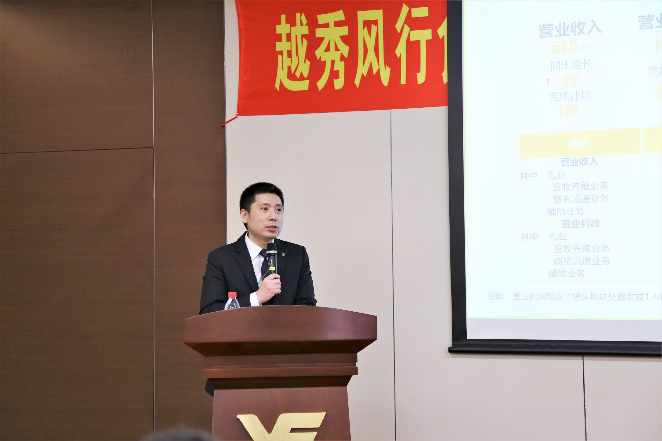 强化能力绘新篇》的总经理工作报告,对于2020年的工作情况,他从七个方面做出总结:一是主要经营指标基本完成,规模向好。对比上年企业营业收入增长了22%。二是重点项目成果突出。完成了板块重组整合;生猪产业发展按下“快进键”,快速储备了373万头生猪产能用地,首个大型自建项目实现竣工和引种;成功重整辉山乳业,乳业实现全国化布局;接管皇上皇、食品集团,产业链条补齐。三是业务发展齐头并进。乳业、风行农牧、商贸、生鲜、冷链、大湾区“菜篮子”项目、资产经营等工作成效显著。四是组织管控不断优化。战略投资与运营管理、人才队伍建设、资金与费用管理、风险防控、信息化建设、安全管理、品牌、档案、保密管理工作有效提升。五是党建引领,融合发展。基层党建、巡察整改、执纪监督问责、企业文化与群团组织建设、扶贫攻坚、意识形态工作融合发展。六是企业在业务战略、核心能力、专业人才队伍、激励机制、安全生产管理等方面还存在短板。
